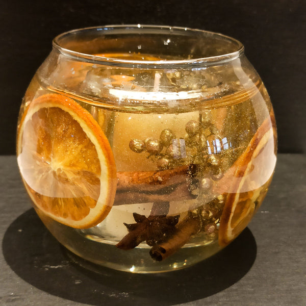 Festive Orange and Spices Soy Wax Scented Candle Bowl. Celebrating all things festive with zesty, uplifting fusions of orange and lemon with a heart of jasmine and fresh pine embraced by warming cinnamon, clove and ginger. All of which gently descend onto the sensuous base notes of woods and musk. The soy and gel wax scented candle has been decorated with dried orange slices, cinnamon sticks, gold berries, star anise and crushed gold crystal to add a subtle shimmer.