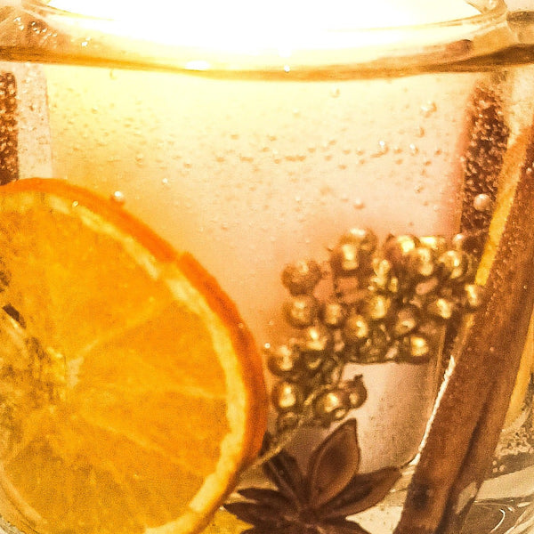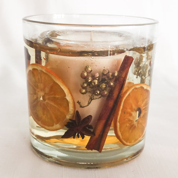 Festive Orange and Spices Soy Wax Scented Candle (Large). Celebrating all things festive with zesty, uplifting fusions of orange and lemon with a heart of jasmine and fresh pine embraced by warming cinnamon, clove and ginger. All of which gently descend onto the sensuous base notes of woods and musk. he soy and gel wax scented candle has been decorated with dried orange slices, cinnamon sticks, gold berries, star anise and crushed gold crystal to add a subtle shimmer.