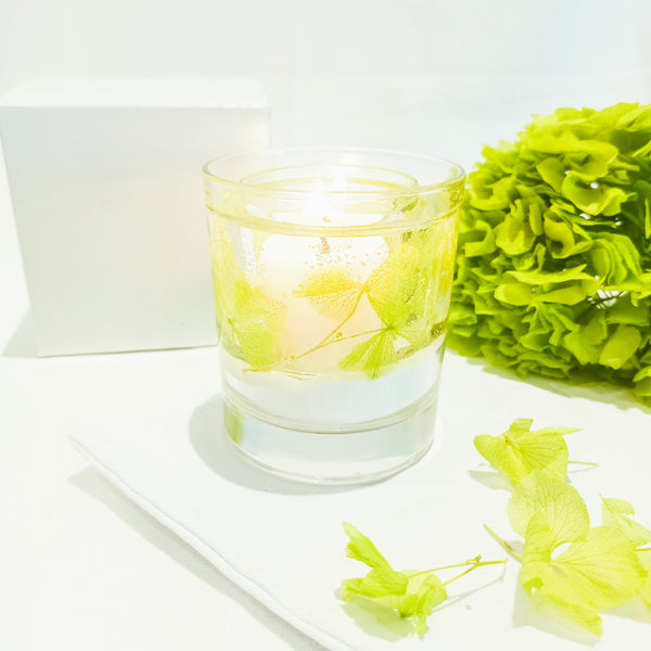 Green Grass and Hydrangea. As fresh and lush as a sparkling Summer rain shower this scented botanical candle encompasses the vibrant, floral tones of violet, field grass and water lily. This handcrafted candle uses real green hydrangea petals that are suspended in a soft gel wax surrounding the central soy wax votive candle. When your soy wax candle has finished, simply replace with a tealight and continue to enjoy. This candle is made to order and arrives in a giftbox.