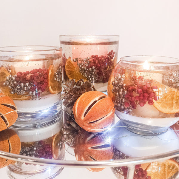 Sparkling Cranberry Soy Wax Scented Candle Bowl. A sparkling fruit cocktail of zingy ripe red cranberries and sweet raspberries infused with zesty lime leaves. The heart is a mix of peach, jasmine and rose which rests on a base of musk, tonka, vanilla and caramel. The scented soy and gel wax candle has been hand decorated with vibrant dried oranges and pink and silver berries which rest on a bed of snow white sand. This item is reusable and comes with a soy refill. Also suitable for tealights and safety candles